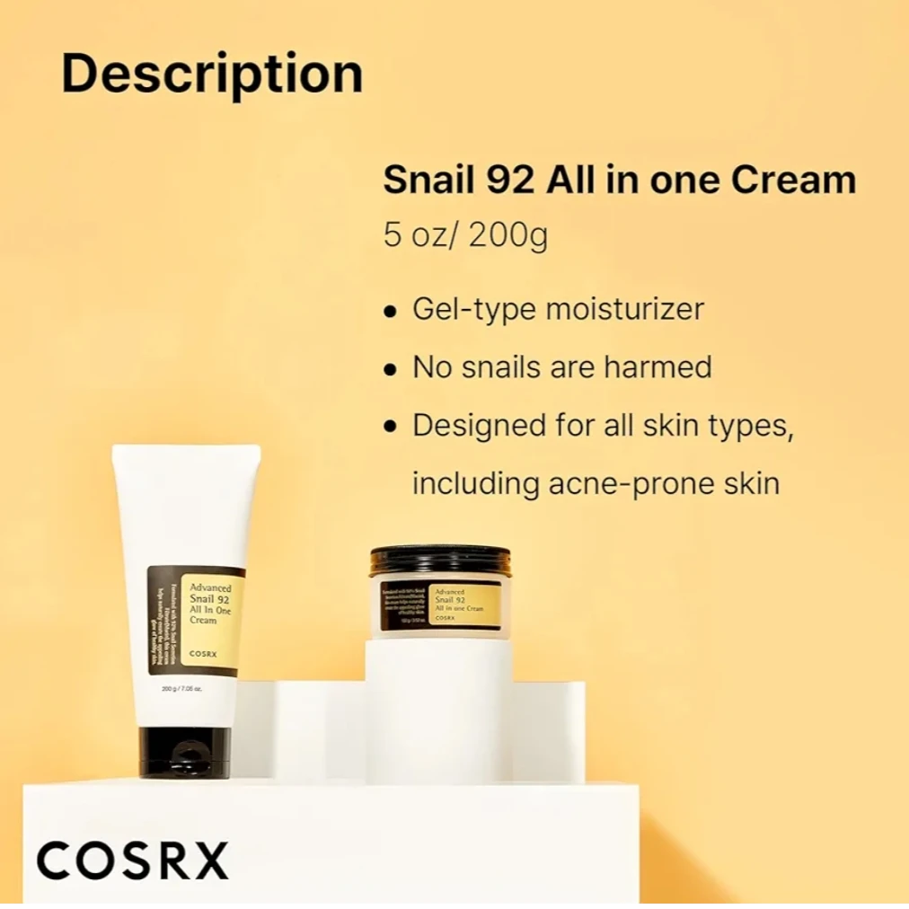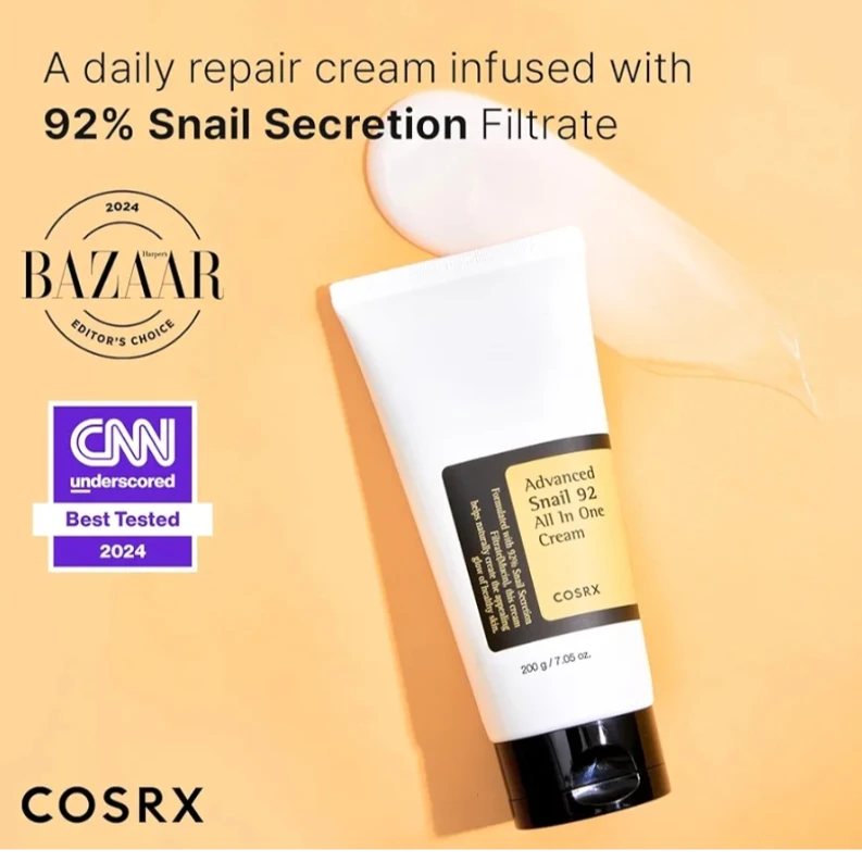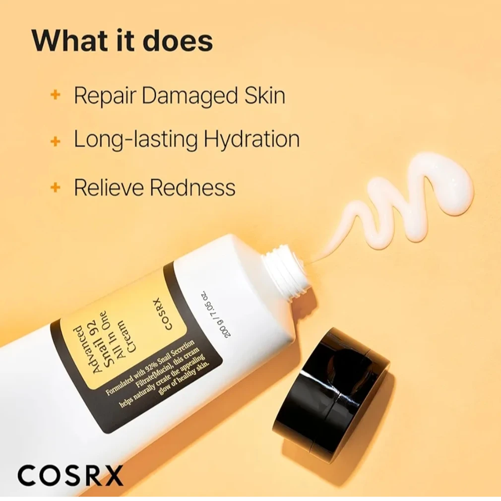 كريم COSRX Advanced Snail 92 All In One Cream (كريم الحلزون المتكامل بنسبة 92%) هو كريم كوري شهير للعناية بالبشرة، غني بـ 92% من مستخلص إفراز الحلزون (Snail Mucin) المعروف بقدرته على إصلاح وتجديد خلايا البشرة.
