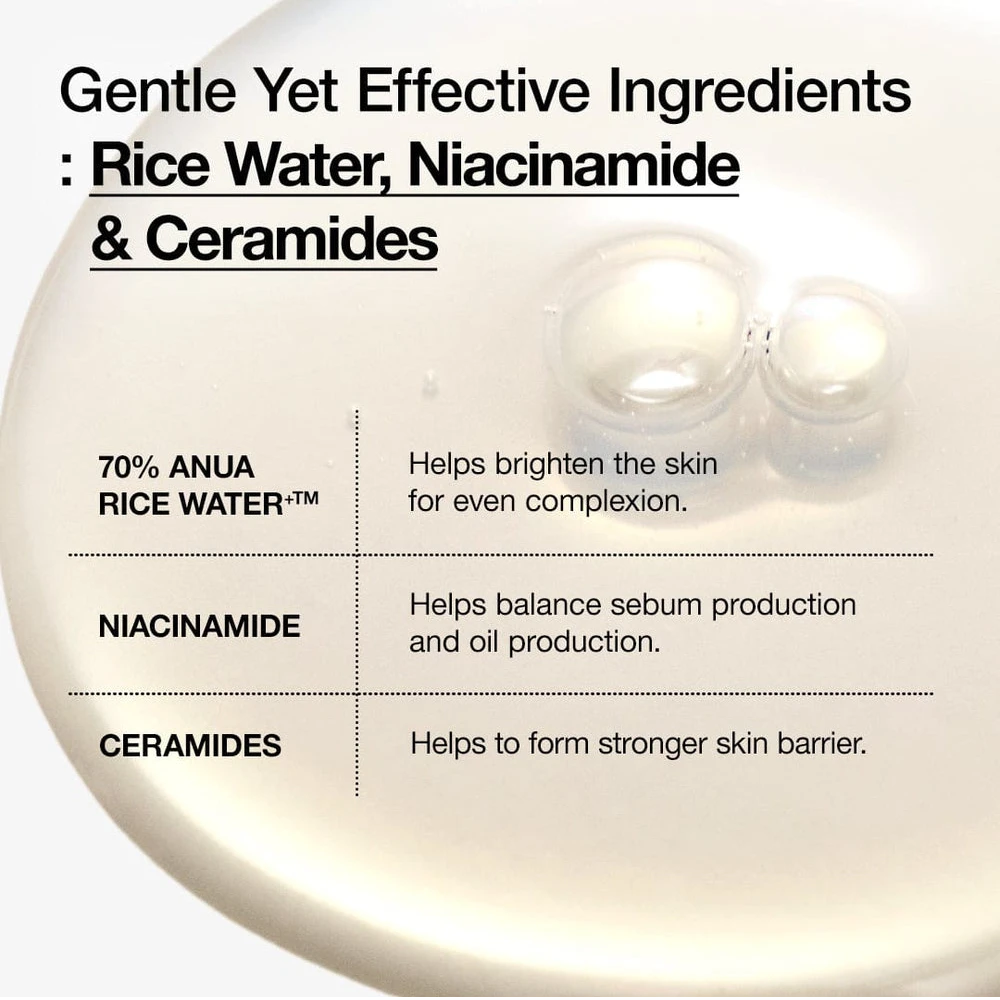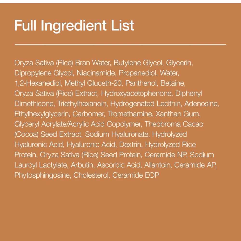 ماء نخالة الأرز (71%)، بوتيلين جليكول، جلسرين، ثنائي بروبيلين جليكول، نياسيناميد، بروبانديول، ماء، 1،2-هيكسانيديول، ميثيل غلوسيث-20، بانثينول، بيتايين، مستخلص الأرز (3753 جزء في المليون)، هيدروكسي أسيتوفينون، ثنائي فينيل دايم ثيكون، ثلاثي إيثيل هكسانوين، ليسيثين مهدرج، أدينوسين، إيثيل هكسيل جلسرين، كاربومير، تروميثامين، صمغ زانثان. كوبوليمر غليسيريل أكريلات/حمض أكريليك، مستخلص بذور ثيوبروما كاكاو (الكاكاو)، هيالورونات الصوديوم، حمض الهيالورونيك المُحلل، حمض الهيالورونيك، دكسترين، بروتين أرز مُحلل (3000 جزء في المليار)، بروتين بذور أوريزا ساتيفا (الأرز) (3000 جزء في المليار)، سيراميد NP، لاكتيلات لوروي الصوديوم، أربوتين، حمض الأسكوربيك، ألانتوين، سيراميد AP، فيتوسفينجوزين، كوليسترول، سيراميد EOP