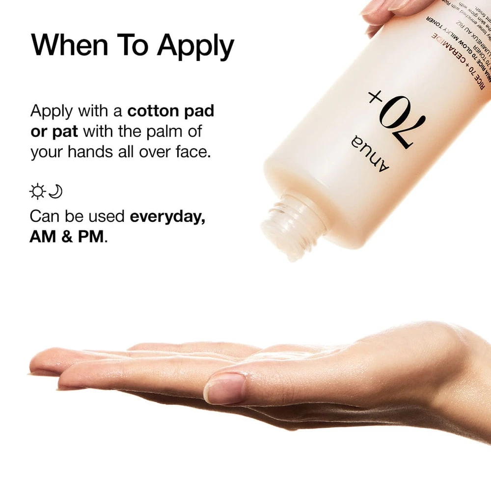 بعد تنظيف وجهك جيدًا، ضعي التونر باستخدام قطعة قطن أو أطراف أصابعك. ربتي بلطف على كامل الوجه. يمكن استخدامه صباحًا ومساءً